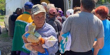Distribution d'aide humanitaire avec nos partenaires de la Fondation Hurkit. Les habitants de Kherson reçoivent de l'eau potable et des filtres à eau